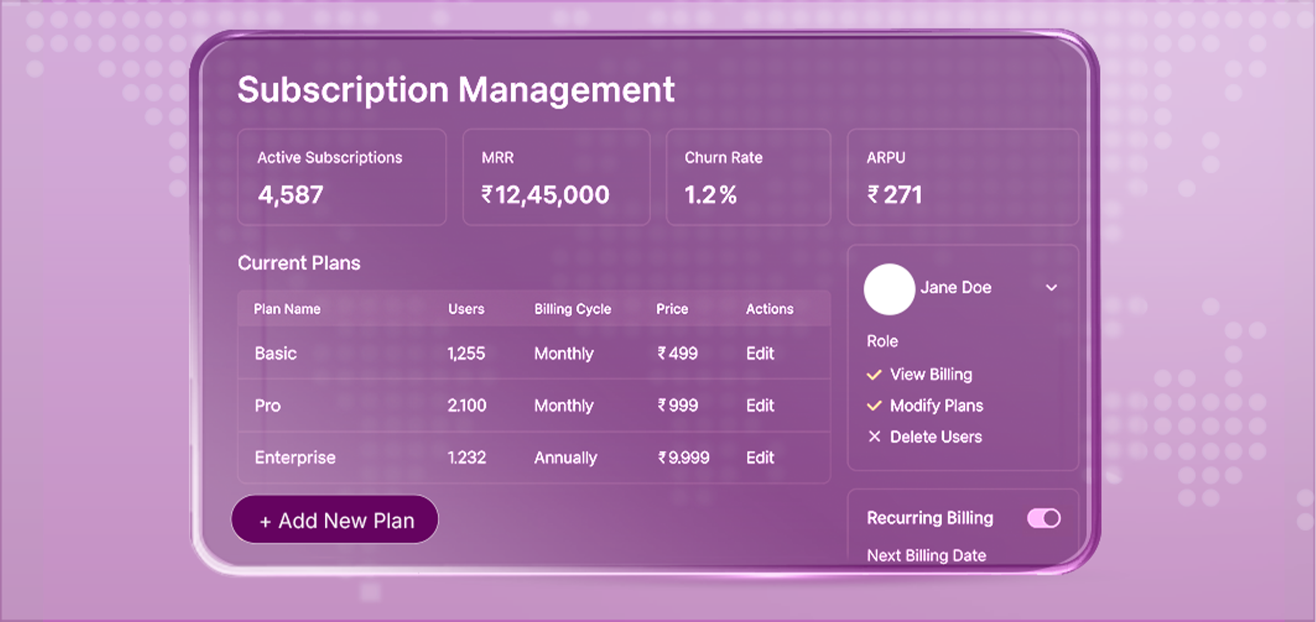 Support recurring billing, subscription cycles, and user-level controls - no matter your pricing model.